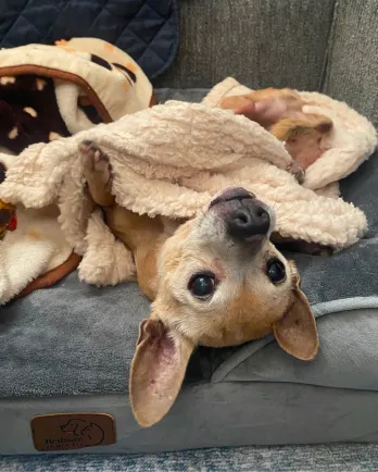 From dental surgery to address painful disease to treatment for hypertension, arthritis, and luxating patellas, Olivia is now thriving in foster care. And despite everything she’s been through, she still loves nothing more than snuggling up in cozy blankets and giving endless kisses.