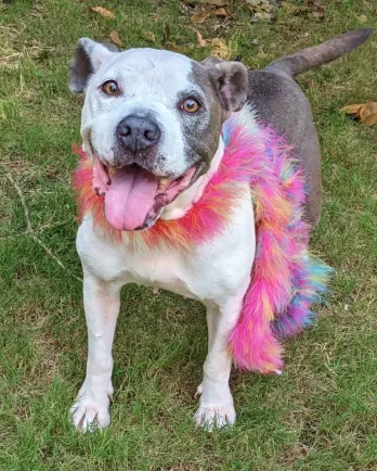 Maybe in dog years eleven years old is considered a senior, but this gracious Southern Belle keeps a youthful outlook on life. She flashes a Miss America smile all day, everyday, wherever shegoes as if to say "live the life you love, don't worry be happy!" It's not official, but we're pretty sure she holds the record for most tail wags ever, and you'll feel honored to be in her presence. Being a lady, Dixie likes to wear her pearls whether on outings, posing for Instagram, scratching her back in the cool grass, or helping babysit toddlers. A devoted fancier of couch cuddles, she simply adores people! This lovely miss priss gets along well with other dogs, but finds felines pesky. A great help in the kitchen, she's always willing to pre-wash the dishes. Dixie is ready to prance her booty into the life of a family looking for some extra joy. Est. birthdate is Feb. 2011, vaccinated, spayed, microchipped. Adoption fee $200.00. She'll steal your heart, we promise!
