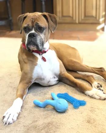 This stunning lady is Lexi. She is tall and elegant, and as lovely in personality as she is in looks. Lexi came into our care with what the shelter believed was a mass on one of her knees. In fact, it turned out to be a proliferation of boney development and bone displacement due to a very old injury - a severely displaced kneecap, which, due to its specific nature, our vet does not believe can be repaired. Her other knee has a very old ligament injury which was never repaired and is now stabilized by arthritic changes. In foster care and with medical attention, Lexi has been gaining strength and has greatly improved her mobility. She now gets around very well! Lexi enjoys her boxer foster sibling, and they love to be silly together and to go on adventures. She has met children and cats and is a sweetheart to everyone! Lexi is a brilliant girl and learns very quickly. The newest thing she's working on, now that she's feeling so good, is restraining herself a bit on walks. She's just so full of enthusiasm for life and is so excited to be out in the world! Lexi would love to find her forever home with another dog and people who want to spend as much time with her as she wants to spend with them.