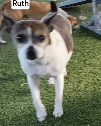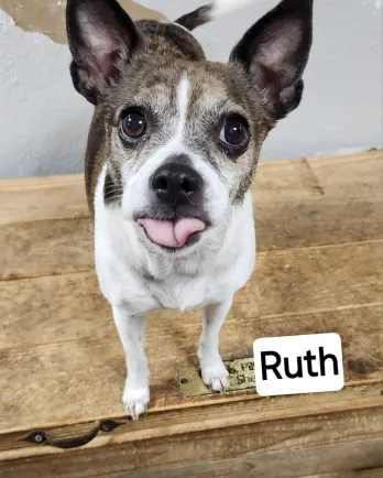 Hi there, I'm Ruth! I'm a seasoned gal with a heart full of love and a spirit that's still spry. I was the pampered pooch at a sanctuary with 40 other dogs, then disaster struck. Our mom passed away. We were sent to a vet hospital, where they convinced A Doggie 4 You to take me and my remaining 5 siblings.